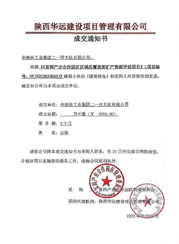 近日,接陜西華遠建設項目管理有限公司成交通知,公司成功中標《富閻產業合作園區區域壓覆重要礦產資源評估項目》。