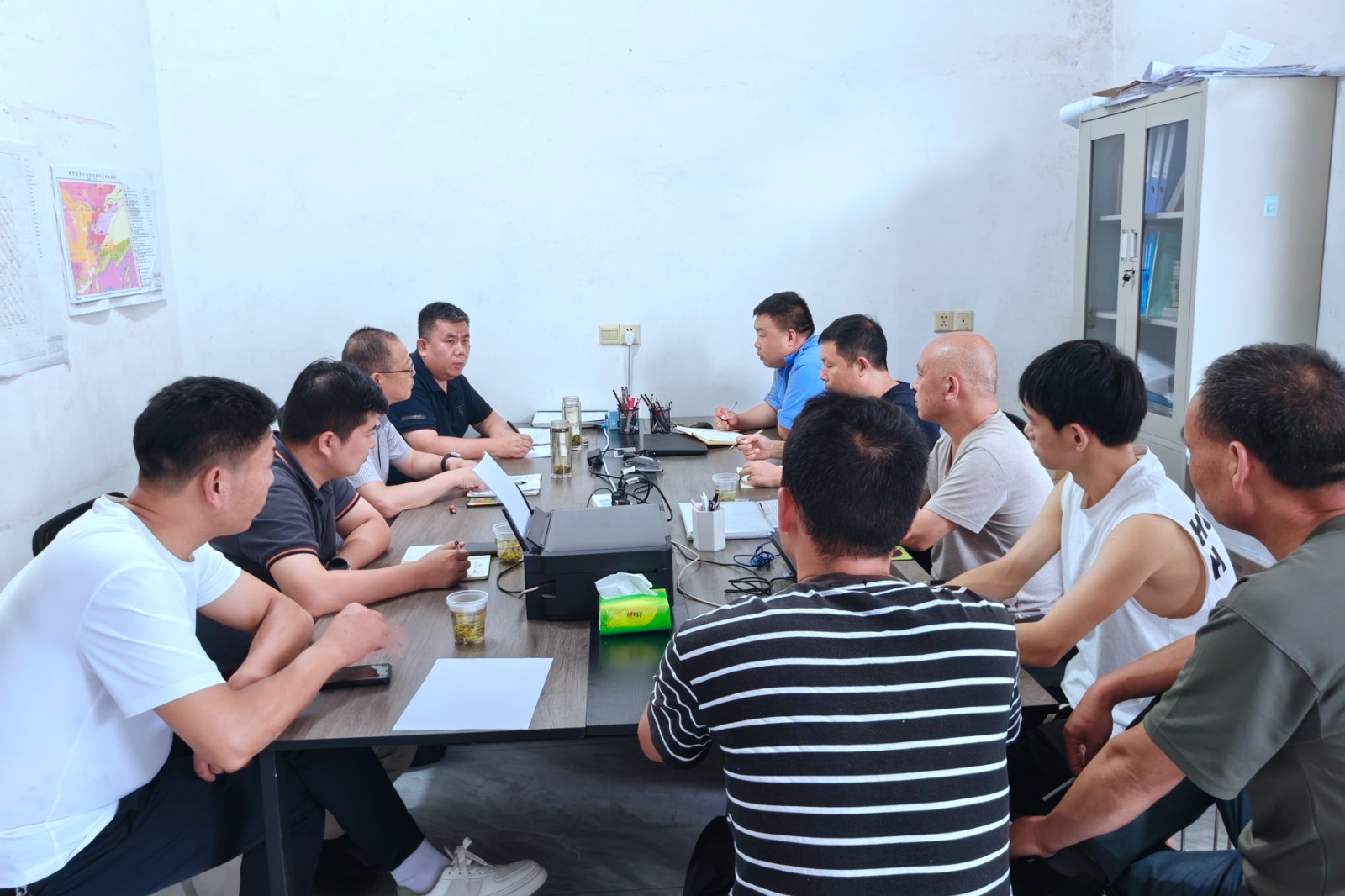 為北溝項目野外一線職工送來了防暑慰問品后,司金強一行聽取了項目負責(zé)人孫德對項目基本情況及最新找礦成果匯報,王朋對項目技術(shù)資料質(zhì)量進行全面檢查,對做好第一期野外驗收工作提出了要求,要提高工作效率,狠抓項目進度,嚴(yán)把質(zhì)量關(guān),及時整理項目資料。安保部重點對近期嚴(yán)峻的防汛工作及項目外包作業(yè)進行安全檢查,強調(diào)了近期防汛工作的重要性,要時刻關(guān)注天氣情況及地質(zhì)災(zāi)害預(yù)警信息,做好防汛預(yù)案和人員職責(zé)分配,通過檢查指出了外包作業(yè)資料不全等問題,要求項目部及時整改。行政部重點強調(diào)資料保密工作,提高保密工作意識,嚴(yán)禁網(wǎng)上傳送保密文件,加強資料管理,要求資料及時歸檔,加強車輛管理,公車使用嚴(yán)格執(zhí)行公司規(guī)章制度,嚴(yán)禁公車私用。