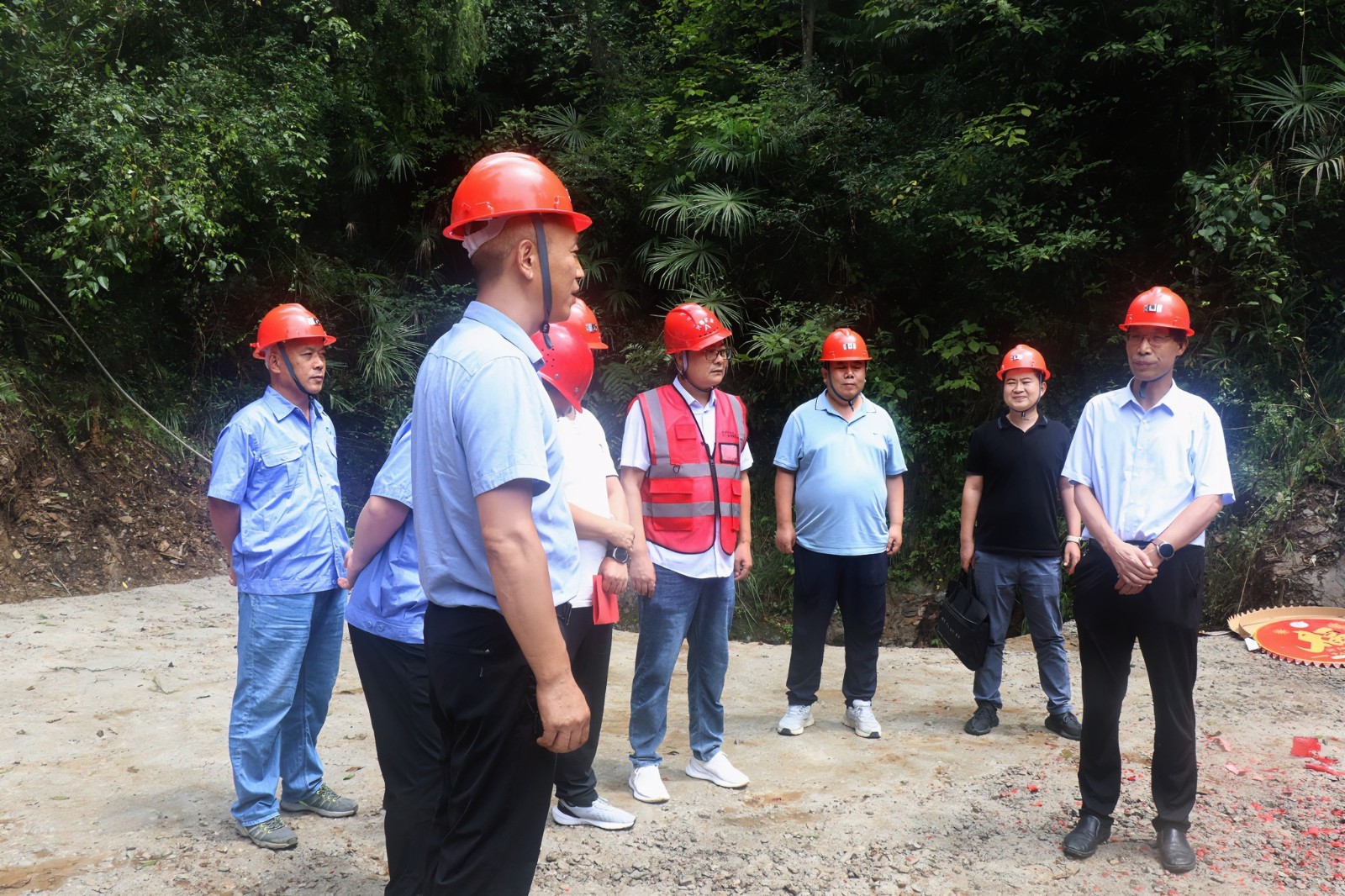 在施工現場,項目負責人就硐探工程的設計方案、施工組織、進度安排等進行了詳細的匯報。鄧盛波在聽取匯報后,首先,對項目組全體工作人員前期的付出表示了充分的肯定,對硐探工程施工方興略公司的密切配合、對寧強縣、陽平關鎮、張家河村三級政府的鼎力支持和幫助表示感謝。隨后,鄧盛波對硐探工程的施工提出了三點要求:一是要高規格強化安全生產,提升安全管理等級,現場要依章依規,規范操作;二是要高標準把控工程質量,硐探工程施工質量和地質編錄質量要全部達標;三是要高效率地組織施工,二一四大隊、興略公司、民爆公司三方要通力協作、有序銜接,如期圓滿完成施工任務。