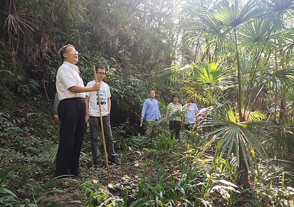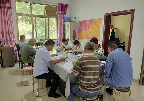 首先,項目經(jīng)理龍立志向曾獻(xiàn)文一行匯報了項目綠色勘查工作的基本情況,包括施工現(xiàn)場對油污、廢液、沉渣及其他固體廢物分類清理、收集并按規(guī)定進(jìn)行消毒、沉淀、固化等處理工作;施工完成后,及時對場地進(jìn)行整平復(fù)綠,并且對復(fù)綠情況進(jìn)行定期查看,確保栽種存活;在探槽施工中,對土石進(jìn)行裝袋堆積,有效防止水土流失,并在施工結(jié)束后進(jìn)行回填和復(fù)綠。