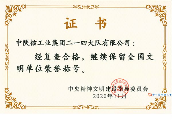 近日,中央精神文明建設指導委員會印發《關于復查確認繼續保留榮譽稱號的全國文明城市、文明村鎮、文明單位的通報》(文明委[2020]9號),公司經中央文明委復查確認繼續保留“全國文明單位”榮譽稱號并頒發證書。