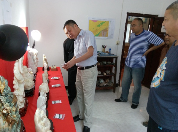 就漢白玉開發和利用,項目組加工制作了漢白玉工藝品,田社生仔細的觀察每一件擺件,并不時的拿出玉石手電筒照看,查看玉雕件的透度,并與在場的項目組人員交流,詳細的詢問了漢白玉礦體的有關情況。