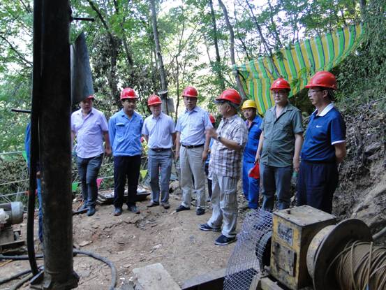 2016年7月20日,中陜核工業(yè)集團(tuán)副總經(jīng)理高利鵬、集團(tuán)安全環(huán)保部部長(zhǎng)張秦在公司總經(jīng)理田社生、副總經(jīng)理司金強(qiáng)的陪同下,深入野外一線城固雙溪項(xiàng)目檢查指導(dǎo)工作。