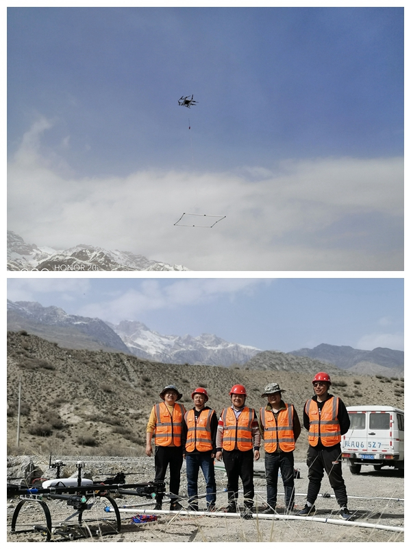 針對該項目工區地形切割劇烈山勢陡峭,常規地面瞬變電磁勘查工作難以開展,受高海拔山地小氣候影響伴隨刮風、降雪、低溫環境給飛行安全造成很大風險。為確保核心技術攻關成果的落地和經濟效益轉化顯著,項目組采用非常規氣動布局大載重旋翼無人機柔性緩沖承重結構作為飛行平臺搭載航空電磁儀和自主研發的重載荷大接收面積接收線圈實現外業數據采集技術團隊齊心協力完成了空域飛行備案,按設計時間節點保質保量完成了外業數據采集。在項目的實施過程中,一線黨員主動發揮先鋒模范作用,極大激勵一線技術人員追趕新技術、學習新知識、靈活新思路、向業界難題發起攻關。