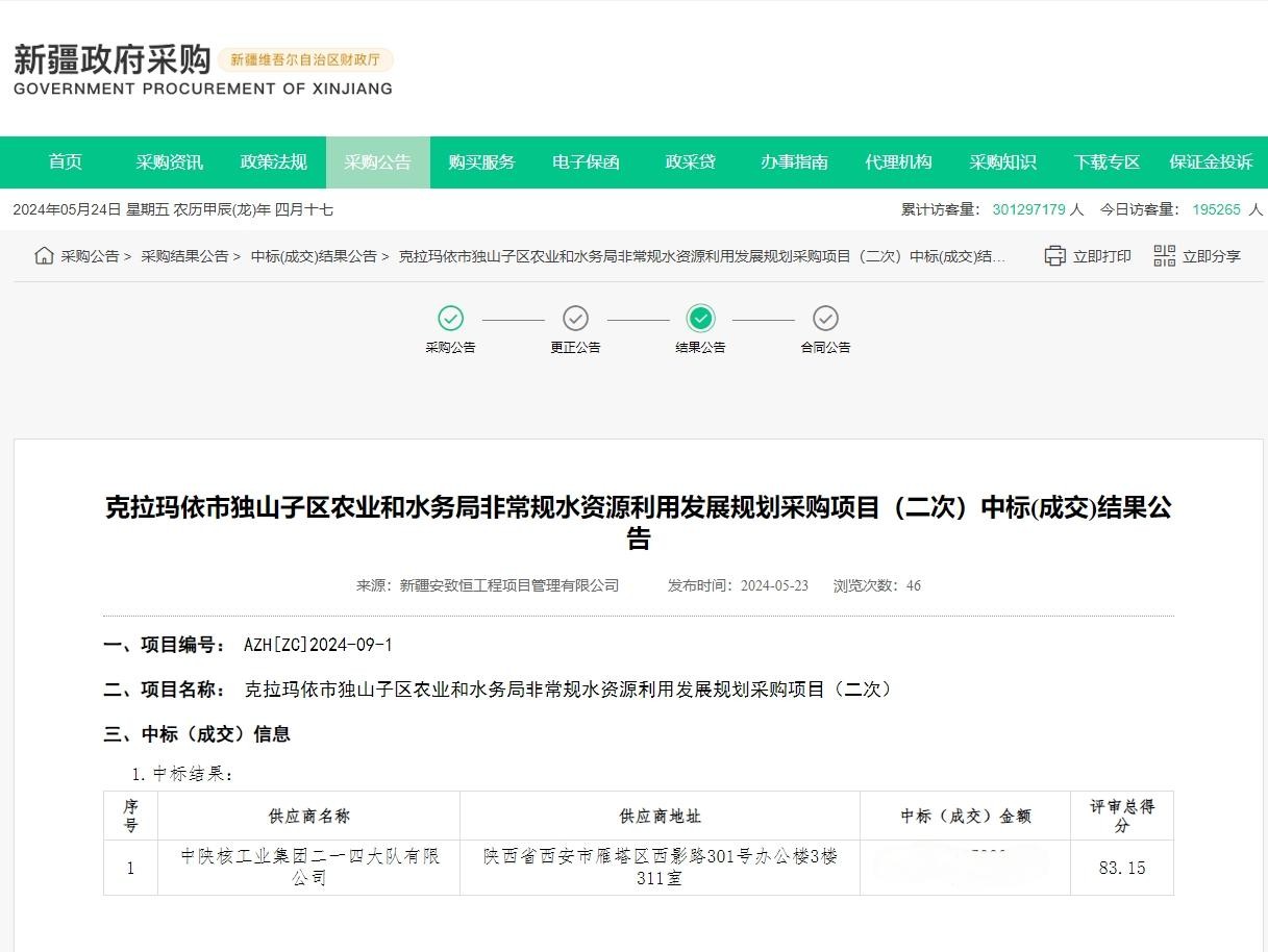 5月24日,通過新疆政府采購網結果公告獲悉,公司水工環院成功中標克拉瑪依市獨山子區農業和水務局非常規水資源利用發展規劃采購項目。